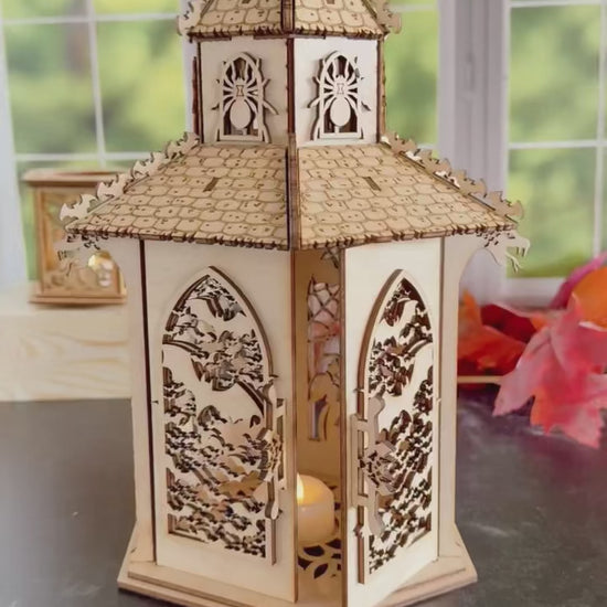 Make a dramatic statement this Halloween with our handcrafted wooden lantern. Designed with gothic-style windows, spider and bat cutouts, and a shingled roof topped with a flying bat finial, this piece glows with eerie charm when lit from within.