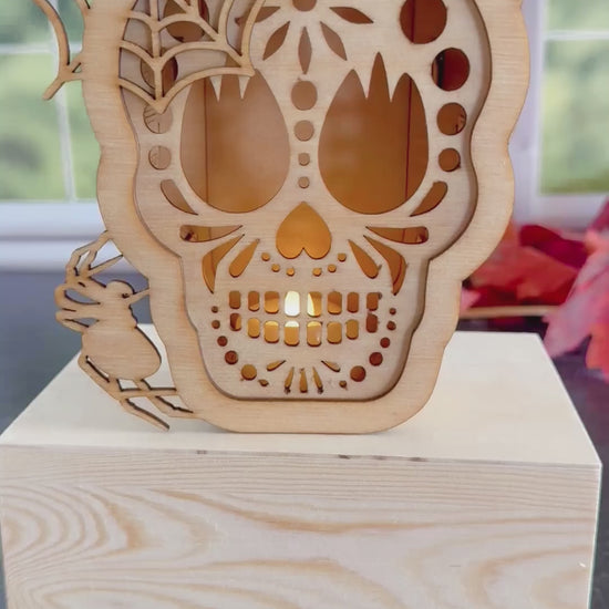 Cast a spooky glow this season with our handcrafted skull tea light holder. Detailed with crawling spiders and a web accent, the laser-cut design lets the candlelight flicker through, creating shadows that are equal parts eerie and cozy.