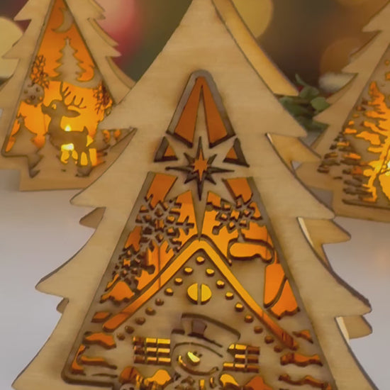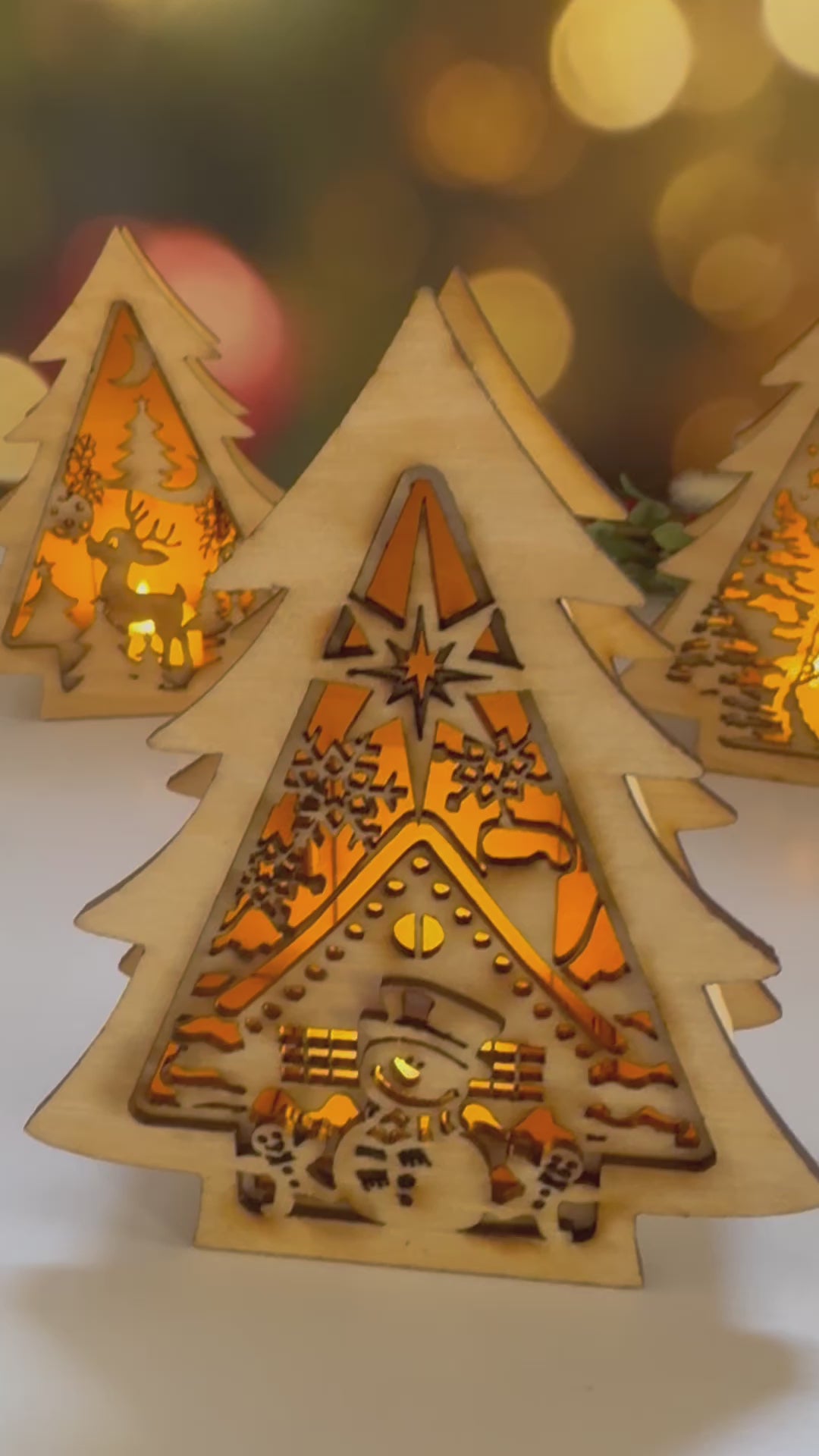 - Shaped like a festive Christmas tree and featuring a choice of three scenes (a snowman, a reindeer, or a gnome), this charming decoration is ready to bring instant warmth and cheer to any room.
