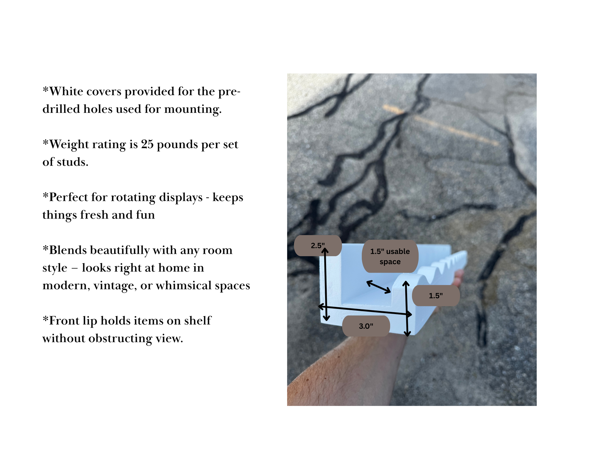 šŖ Installation: Each White Painted Scalloped Kid's Floating Shelf comes with pre-drilled holes spaced 16" apart for standard stud mounting. Screws, drywall anchors, and simple instructions included for quick installation.